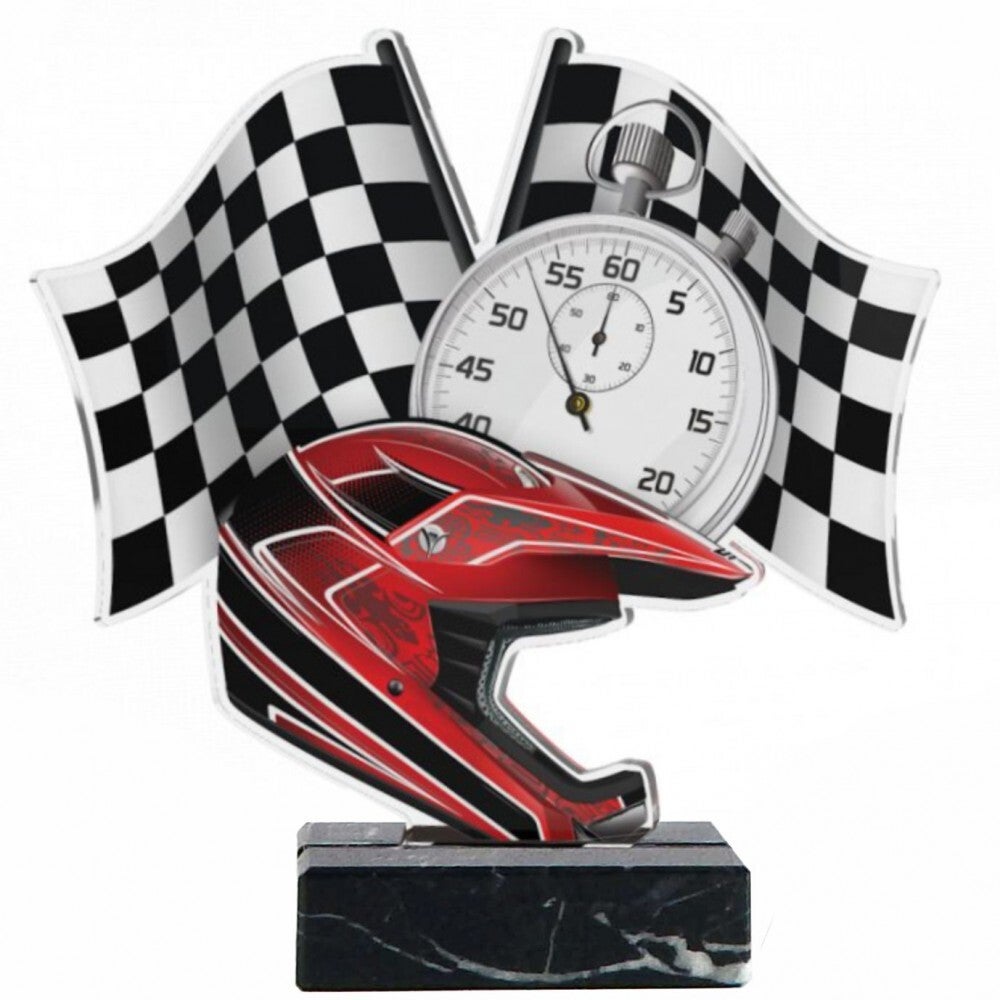 Trofeo fabricado en metacrilato y base de mármol, con motivos de motocross.