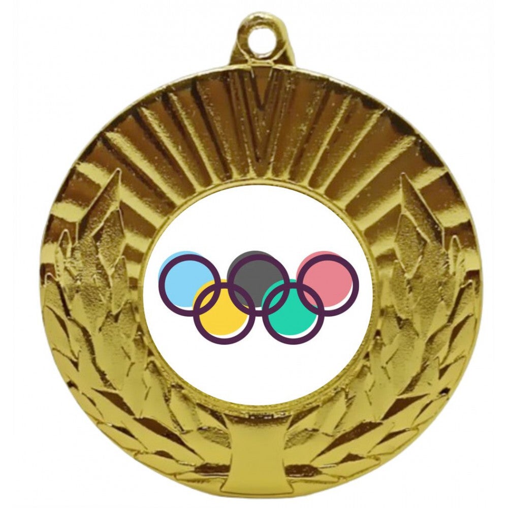 Medalla metal color oro, tamaño de 5 cm de diámetro con disco central de 2,5 cm para incluir deporte o logo.