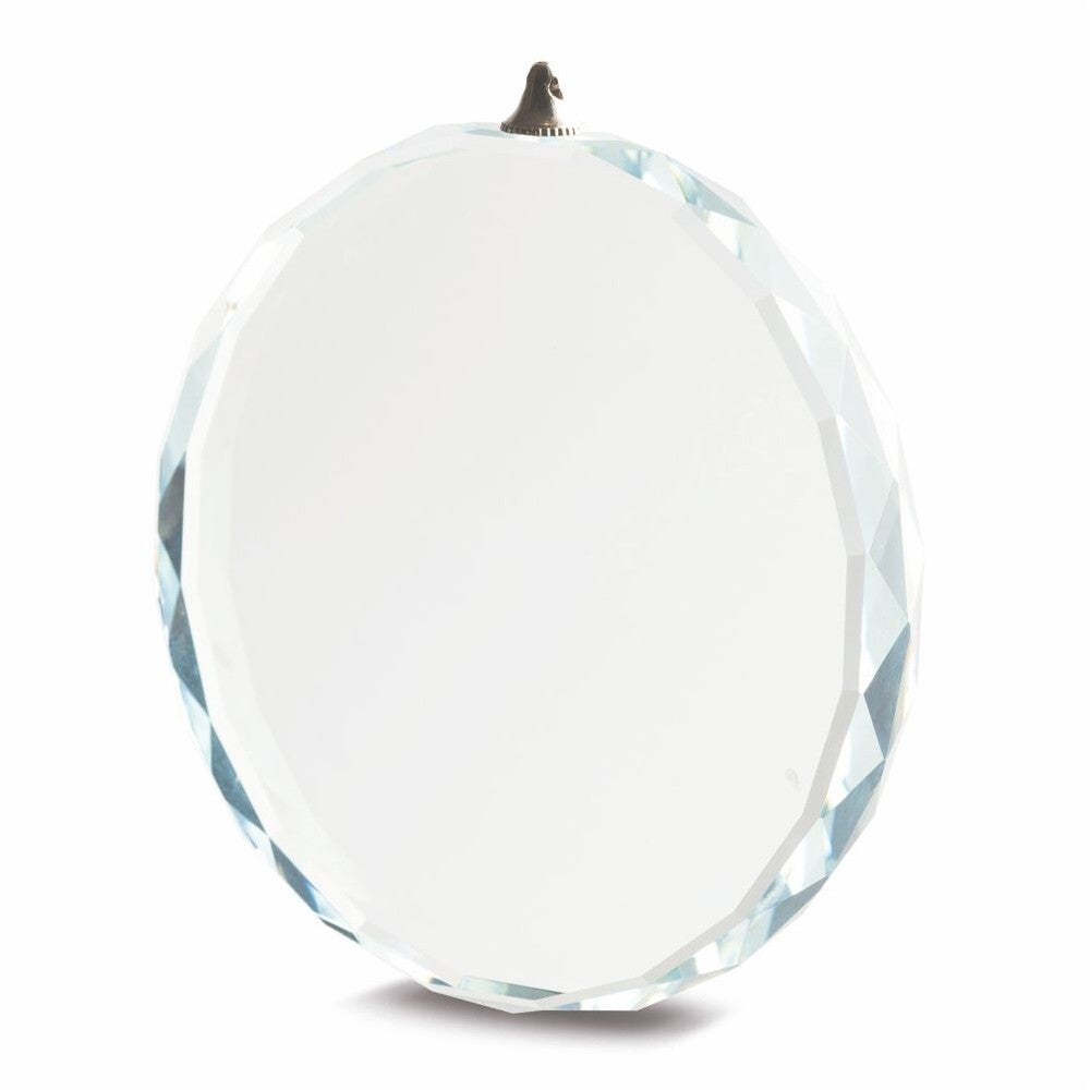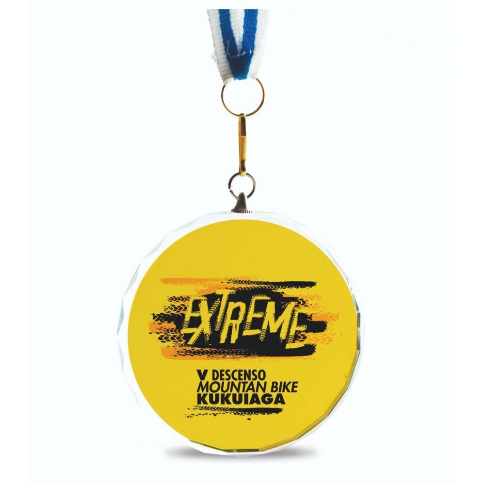 Medalla de cristal de borde diamantado con grabado a color personalizado y cinta incluidos en el precio.Mándanos tu logo, idea, texto y te mandamos el diseño.