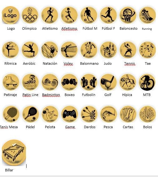 Medalla color oro de 70 mm de diámetro, con disco central de 50mm para incluir deporte o logo.