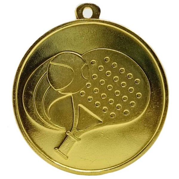 Medalla color oro de 50mm de diámetro con motivo de pádel.