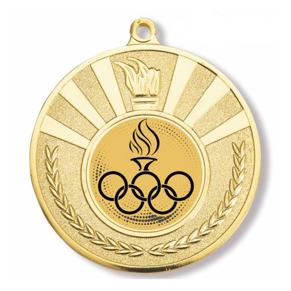 Medalla color oro de 5 cm de diámetro con disco central de 2,5 cm para incluir deporte o logo.