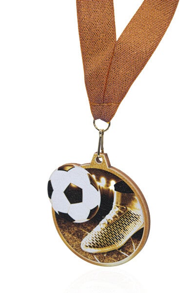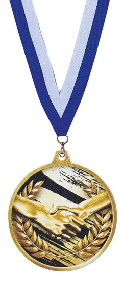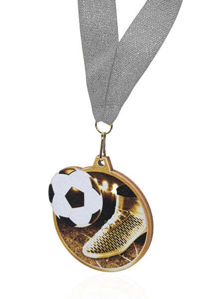 Medalla en madera de diámetro 70 mm, grosor 3mm y cinta de 10 mm.