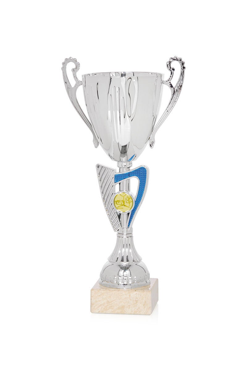 Copa fabricada en metal, ABS metalizado y base de mármol.