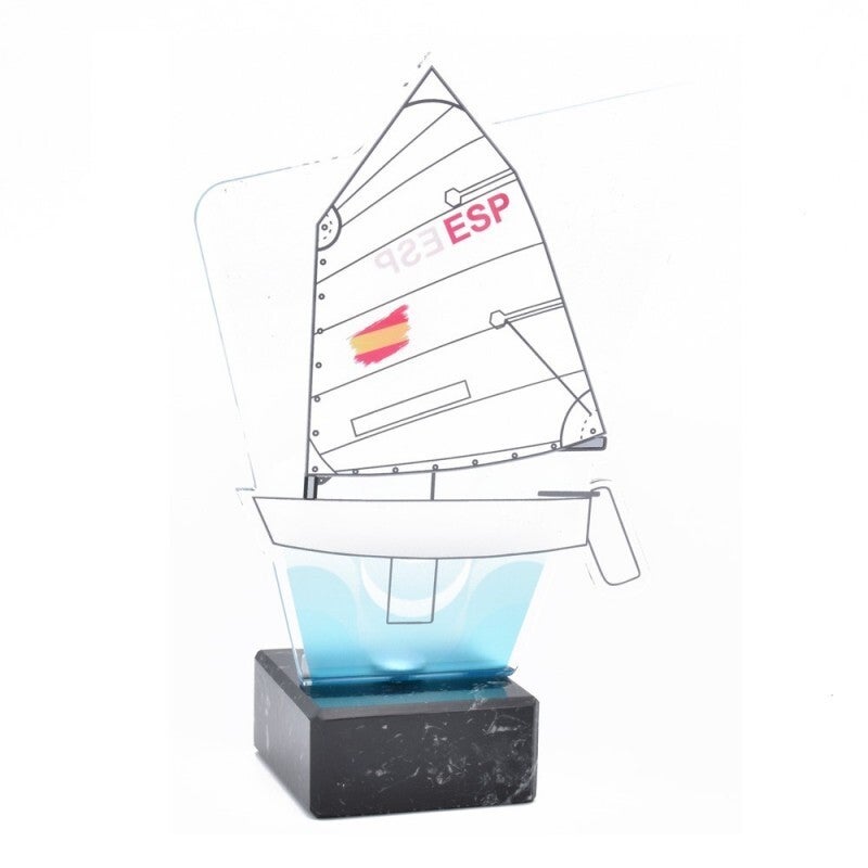 TROFEO VELA CON BANDERA ESPAÑOLA DE METACRILATO CON BASE DE MÁRMOL NEGRO.