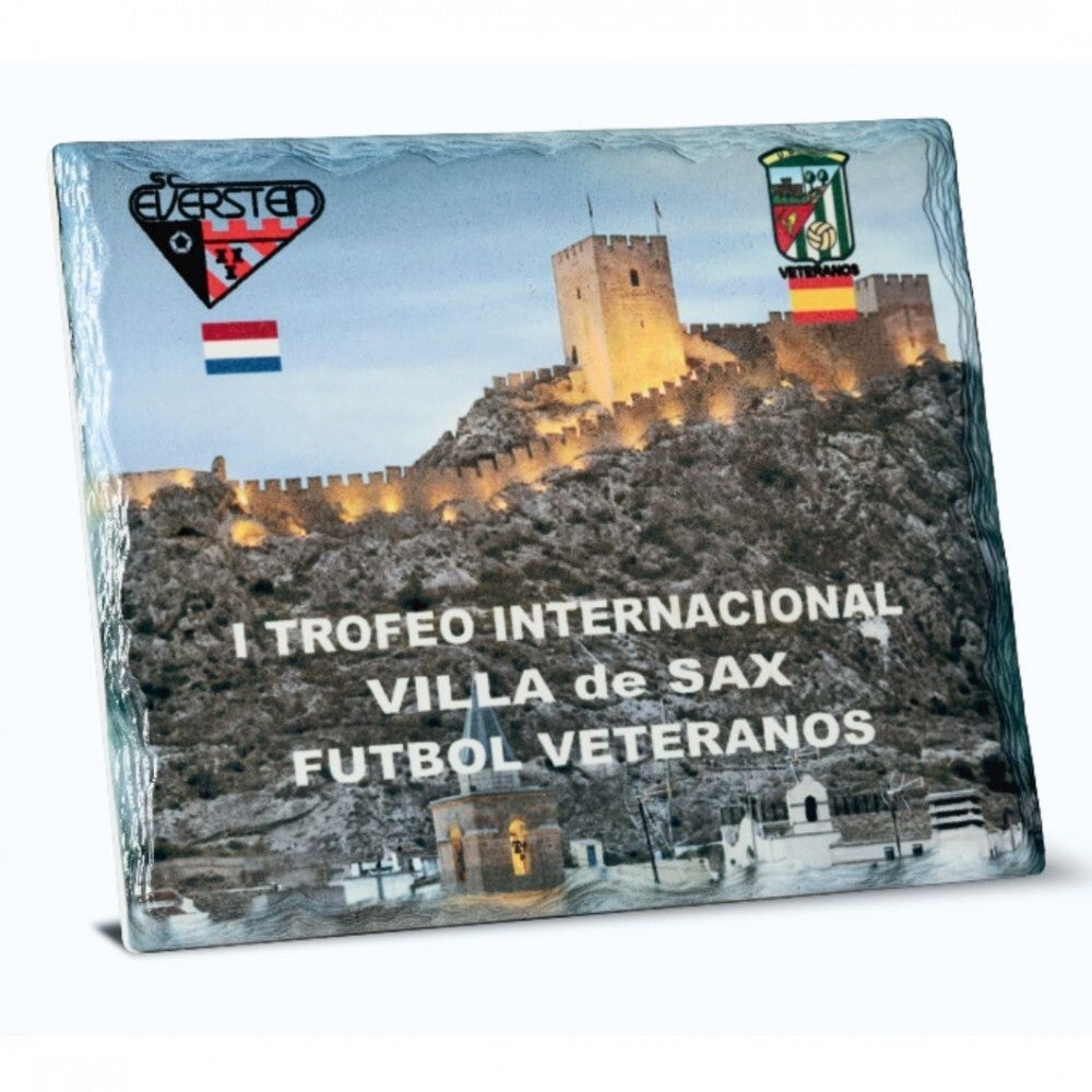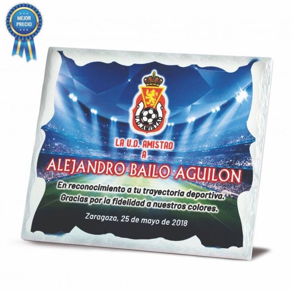 Placa pizarra cerámica RGB para personalizarla con fotos y textos que subas. Dispone de un soporte en su trasera y argolla para sujeción en pared.